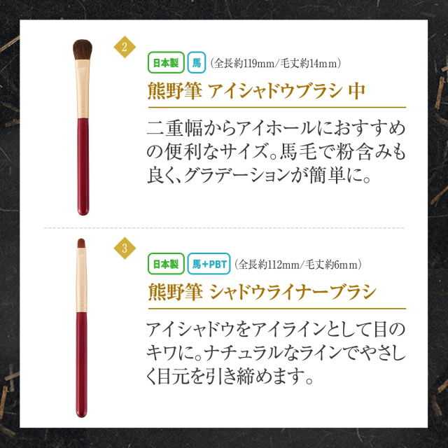 | セット内容 | [熊野筆 丸平チークブラシ] 原毛:山羊毛 全長:約130mm 毛丈:約35mm [熊野筆 アイシャドウブラシ 中] 原毛:馬毛 全長:約119mm 毛丈:約14mm [熊野筆 シャドウライナーブラシ] 原毛:馬毛+PBT毛 全長:約112mm 毛丈:約6mm [熊野筆 リップブラシ] 原毛:イタチ毛+PBT毛 全長:約115mm 毛丈:約10mm [ブラシ&コーム] 原毛:馬毛(たてがみ) 全長:約119mm 毛丈:約12mm [ブラシケース] 素材:PU(ポリウレタン) サイズ(開いた状態):約285mm×約192mm |